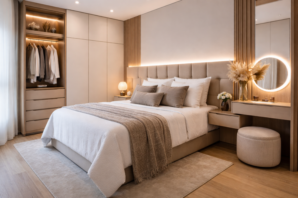 Dormitório planejado com marcenaria sob medida, priorizando conforto, organização e acabamento refinado.