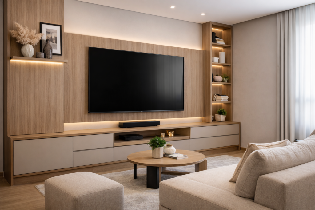 Projeto de painel e home integrado, desenvolvido para valorizar o ambiente, esconder fiações e garantir um acabamento limpo e sofisticado.
